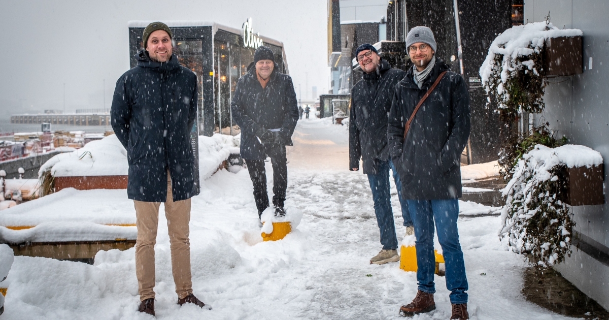 Fra venstre: Børge Kristensen (prosjekt- og bærekraftsjef i Hundholmen Byutvikling), Morten Jakhelln (eier, Christian Jakhelln AS), Arve Pedersen (direktør utleie og relasjon Hundholmen Byutvikling) og Thomas Jakhelln (administrerende direktør Hundholmen Byutvikling)under gjennomgang av framdrifta ved byggetomta i havet. (Foto: Christine Karijord)